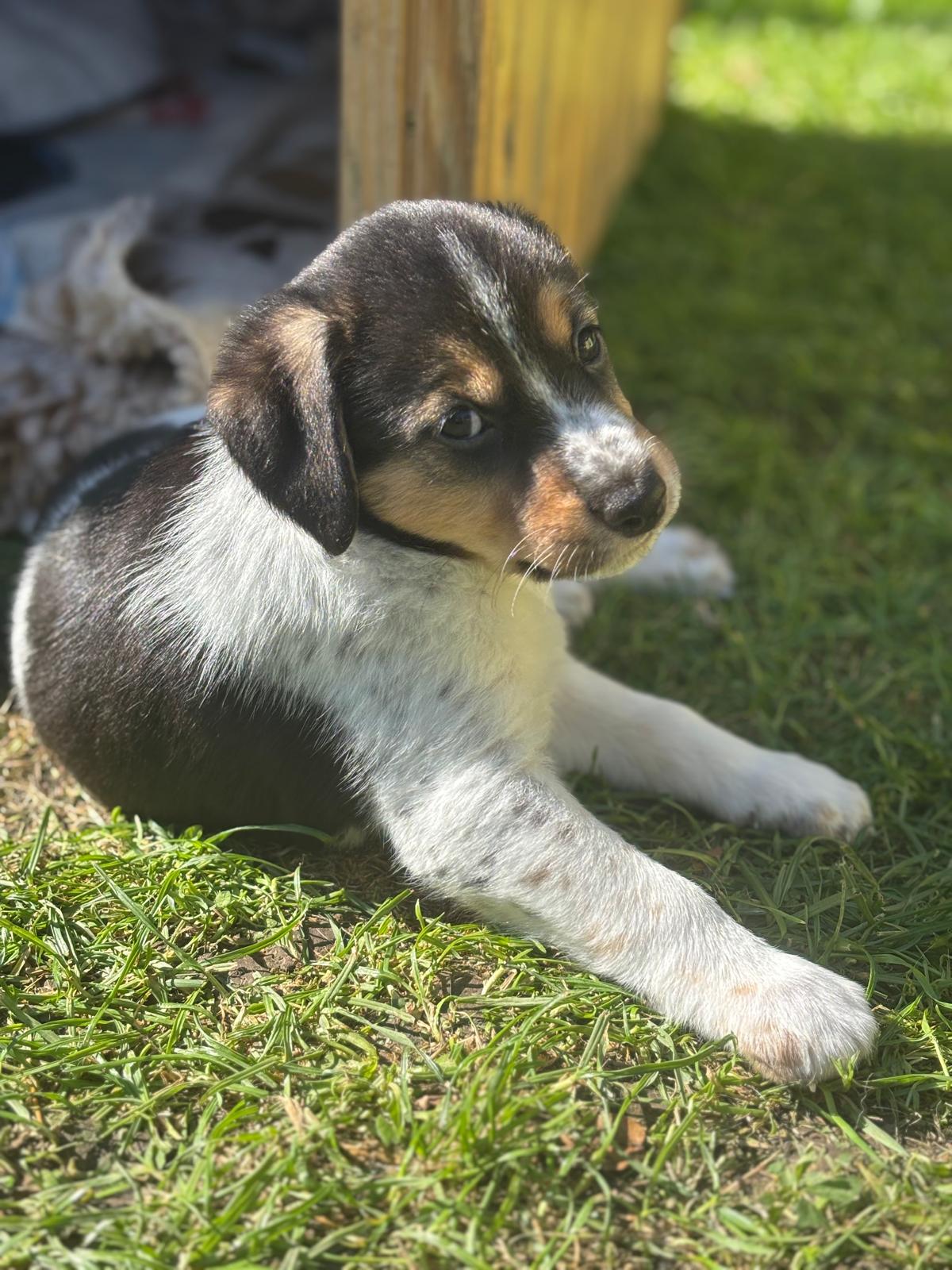 15. 6. 2023: Během tohoto týdne u nás nastaly velké pokroky. Se štěňaty začíná být sranda. Všechna už koukají a slyší, objevili jsme také první zuby. Během chvilek, kdy jsou vzhůru, pochodují prckové po bedně a zvědavě zkoumají prostor, nás, sourozence... Navzájem se okusují a tahají se za ocásky. Někdy se zkouší rozběhnout, ale pravidelně při tom upadnou. Změny se projevují i ve vzhledu. Množství černých skvrnek se zvětšuje a na nohách se objevují první hnědé flíčky, také začínají být vidět rozdíly mezi hladkosrstými a dlouhosrstými štěňaty. Budoucí chlupaťáci mají přece jen jemnější, hladkou srst, která je trochu delší za krkem a zvlněná na uších, ostatní mají srst na omak "ježatější" a na uších spíše rovnou. Zatím ještě bez záruky, ale vypadá to, že dlouhosrstá bude Bětka, Barka a asi i Budulín, krátkou srst bude mít Bonifác, Berta a asi i Bobina. Tenhle týden jsme také začali s příkrmy, štěňata dostala první opravdické psí jídlo (mletou krůtu s kozím kefírem) a hned napoprvé ho prakticky vdechla, žádné velké učení a zvykání se nekonalo. Dnešní váhy: Berta 1380 g, Barka 1395 g, Bobina 1035 g, Budulín 980 g, Běta 1089 g, Bonifác 1350 g.